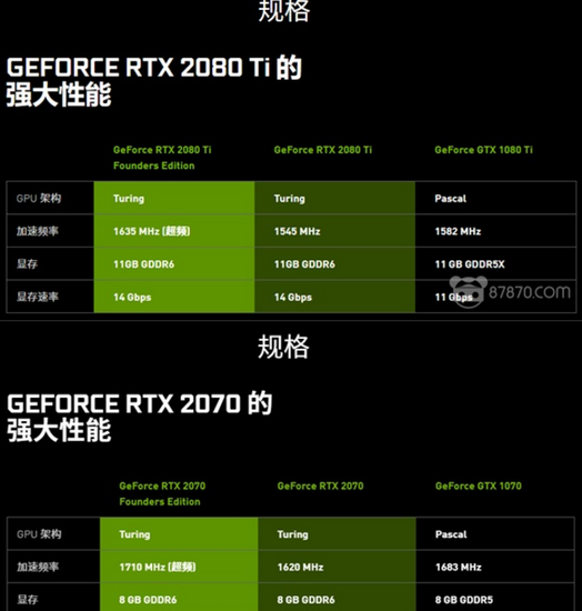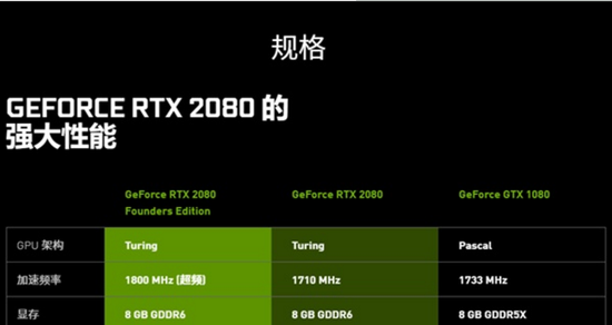 以上是RTX 20系列显卡的代表型号——GeForce RTX 2080的参考性能规格。至于和上一代同级显卡的对比,引用一下官网的表格: