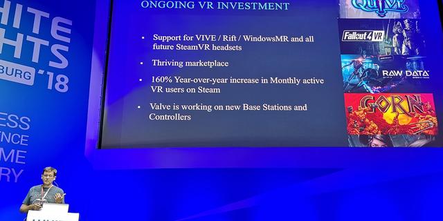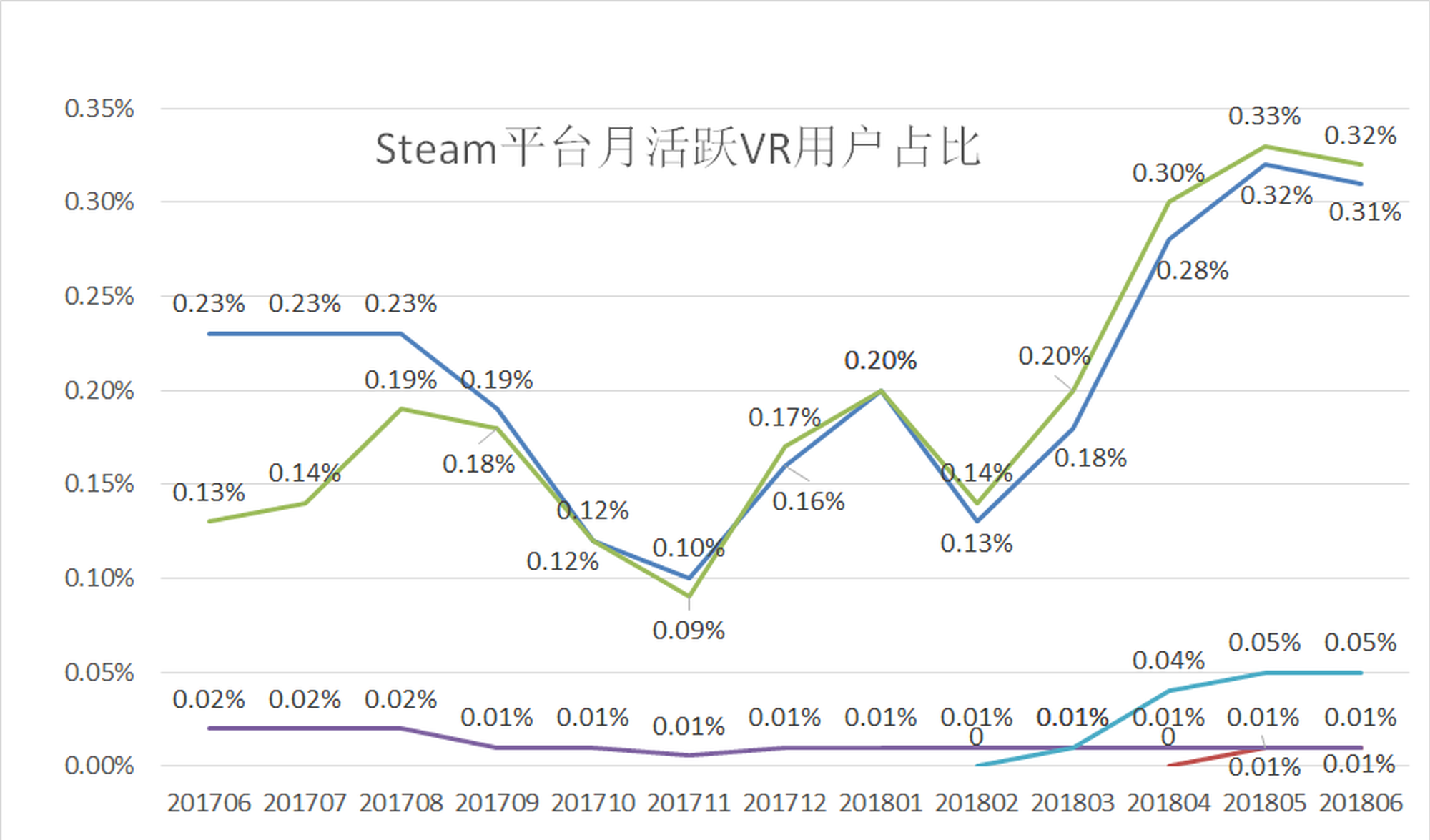 在谈及Valve目前在VR上的投资时,Ewert表示Steam平台VR月活跃用户年同比增长了160%。根据Steam官方公布数据,2017年6月份HTC Vive月活跃用户占比0.23%,Rift CV1月活跃用户占比0.13%,Rift DK2月活跃用户占比0.02%;2018年6月份HTC Vive月活跃用户占比0.31%,Rift CV1月活跃用户占比0.32%,Rift DK2月活跃用户占比0.01%,Vive Pro月活跃用户占比0.01%,WMR月活跃用户占比0.05%