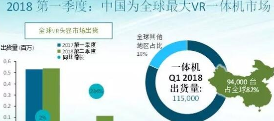 导读:2018年第一季度全球VR头显市场同比增长16%,出货量达到65万台。其中VR一体机同比增长234%,为低迷的VR市场注入了一剂强心剂,是第一季度VR头显市场增长的主要因素。